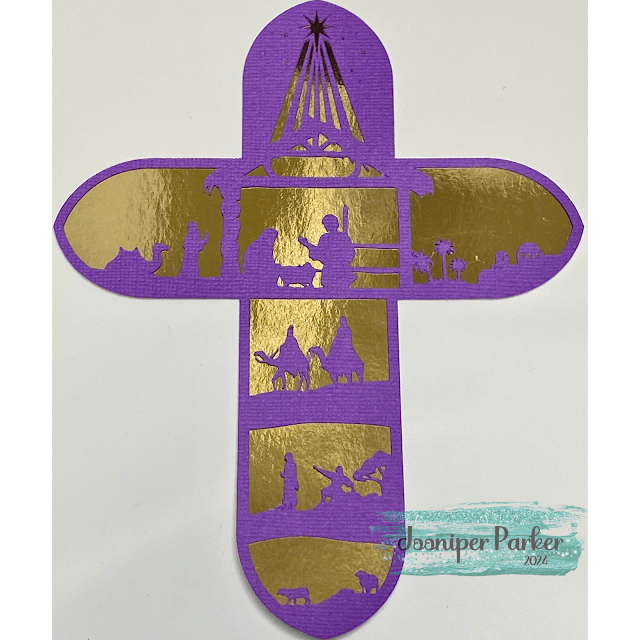I finally got around to cutting the cross nativity Design Space file I posted back in 2017! The photo above shows just how tiny some of the scenes were. A Cricut straight pin for size. I cut it at 6 inches tall to test the new cardstock I got from