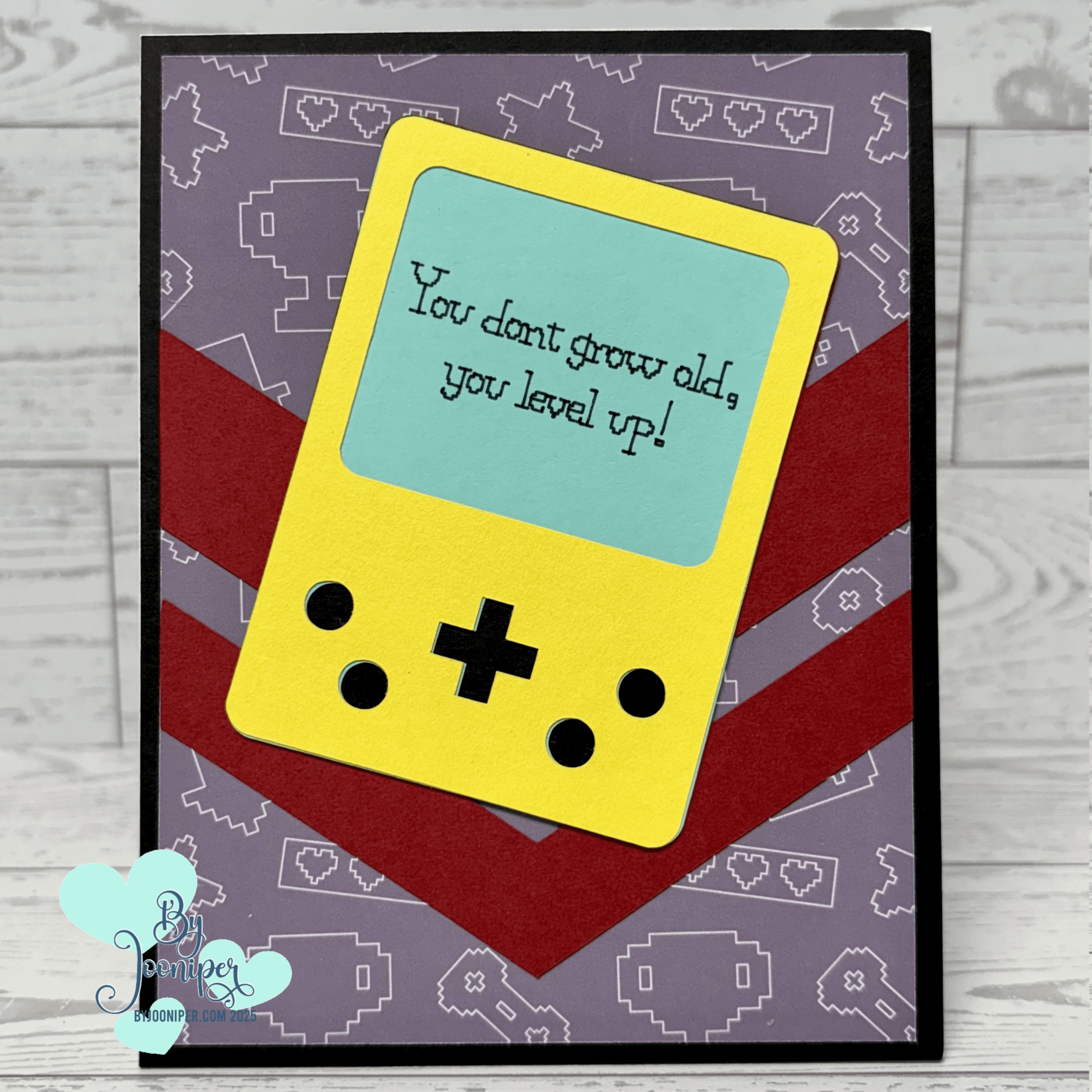 Today, I’m sharing a masculine card perfect for a guy or a boy, with a video gamer theme. I used the Game On digital paper pack and sliced the background image for the digital paper, then did a Print Then Cut. The handheld video game is a Cricut image, and